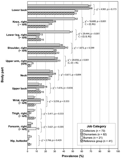 Our findings on discomfort prevalence, the number of body parts affected, and pain scores suggest that the risk of WRMSDs and work disability is higher for collectors and dismantlers than burners and the reference group. A 1-week discomfort prevalence was highest for collectors (91.8 ± 3.2%) and dismantlers (89.0 ± 3.5%) followed by burners (81.0 ± 8.6%) and lastly, the reference group (70.7 ± 7.1%) though the latter was non-trivial. The number of body parts affected was 1.624 to 1.392 times greater for collectors and dismantlers, respectively, relative to burners and the reference group. The location of body parts contributing to the high discomfort prevalence for collectors and dismantlers was also informative (Figure 1). Body parts with a high prevalence of musculoskeletal discomfort for collectors and dismantlers included the lower back (67 vs. 68%), shoulders (36 vs. 42%), upper arms (30 vs. 33%), and neck (25 vs. 28%). Collectors additionally reported a high discomfort prevalence in the knees (52 vs. 28%) and lower legs including ankles/feet (47 vs. 13%) that together point to a high risk of lower extremity MSDs, while the rate of wrist and hand discomfort was twice higher for dismantlers (15%) compared to collectors (7%). Discomfort prevalence for burners was comparatively less and with the lower back (52%), shoulder (29%), knees (24%), neck (24%), and wrists/hands (15%) being most influential.