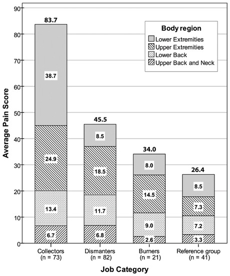 Pain scores (based on a maximum score of 90.0) analysed in our study provide insight into the relative intensity of MSD symptoms among job categories. Whole-body pain scores (mean ± SE) for collectors (83.7 ± 10.6) were about twice more compared to dismantlers (45.5 ± 7.6) and burners (34.0 ± 9.1). Despite the similar discomfort prevalence between collectors and dismantlers (i.e., 91.8 vs. 89.0%), the substantially higher pain scores for collectors suggest a higher MSD symptom severity and interference with work (indicating potential work disability) compared to corresponding ratings for dismantlers. The lower extremities (38.7 ± 50.7) and upper extremities (24.9 ± 33.8) were major contributors to the high whole-body pain scores for collectors, while the upper extremities was the main contributor to whole-body pain scores for dismantlers (18.5 ± 33.2) and burners (14.5 ± 24.1). The low back consistently contributed an average of 13.4 to 9.0 points towards whole-body pain scores for all three e-waste categories.