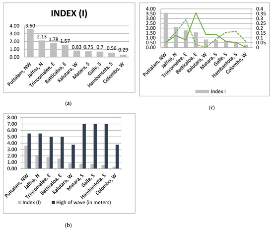 There were extremely different natural-anthropogenic relationships that characterize selected cities, such as in Puttalam (VHI 3.60 and vary good relationships between resilience and exposure) and in Colombo (VLI 0.29 and very bad relationships) (Figure 1a). In three districts: Matara, Galle, and Hambantota located in the south and also in regions of very low index (I) were the higest waves (Figure 1c)