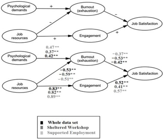 This work aims to use the Job Demands–Resources theory (JD-R) [,,] with a large group of workers with ID belonging to the two most used employment modalities in the hiring of this group (sheltered vs. integrated). More specifically, this study aims to investigate the fit of the two-way process established in the JD-R theory to explain the job satisfaction of these workers. It also aims to explore its appropriateness and validity in the prediction of well-being and job satisfaction, using the procedure of structural equations. An additional aim is to demonstrate the appropriateness of some of its fundamental postulates [,]. Therefore, in accordance with previous predictions derived from JD-R theory, we also predict the following: