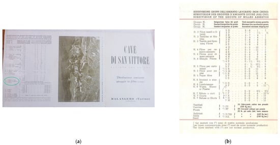 (a) San Vittore (Balangero, Turin, Italy) quarry, flyer extract for asbestos fiber production. Asbestos group 7 is circled in green, probably used for vinyl-asbestos floor. (b) Particularitiesof the subdivision of the group of milled asbestos (source: https://it.wikipedia.org/wiki/Amiantifera_di_Balangero; accessed on 10 January 2021).