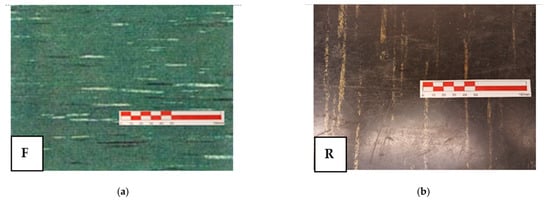 In the present study, a strong mechanical abrasion of R and F vinyl tile samples was carried out using two types of sandpapers, one with a fine grain of P120 and one with a coarse grain of P40 (Figure 11). The abrasion time for each sample was 5 min.