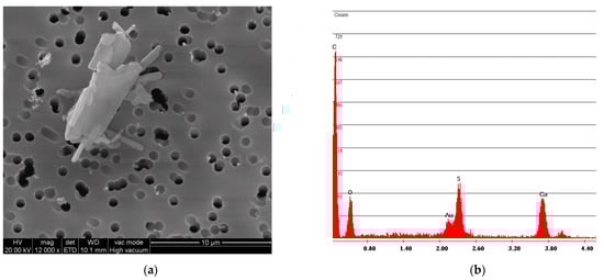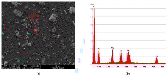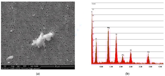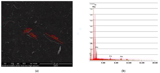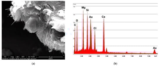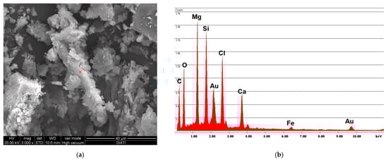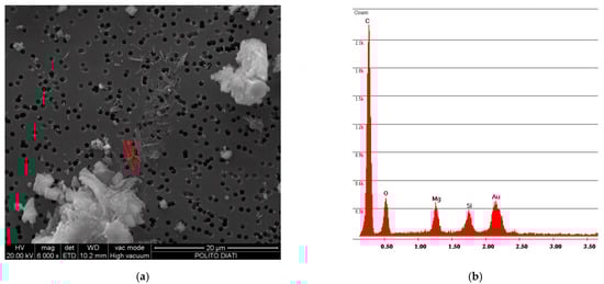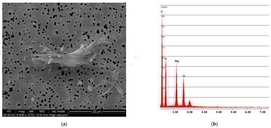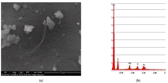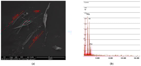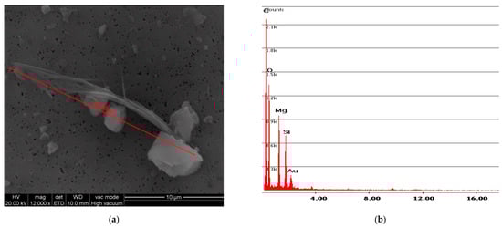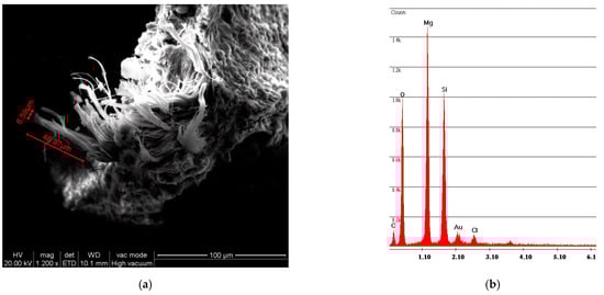 F sample SEM analysis. (a) Photo of free fibers of chrysotile with measurement values; (b) spectrum of chrysotile.