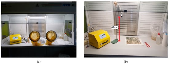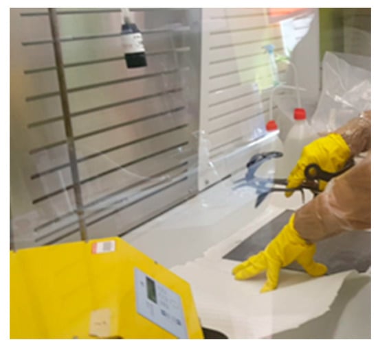 Figure 8 shows the preparation of the hood to carry out the tests. All tests were performed safely in a confined environment using a glove box with the fan off. Airborne sampling was done with a polycarbonate membrane at 45 cm from the table. Between tests, a cleaning of the hood and an airborne analysis was always been carried out to verify the cleanness of the hood to avoid contamination.