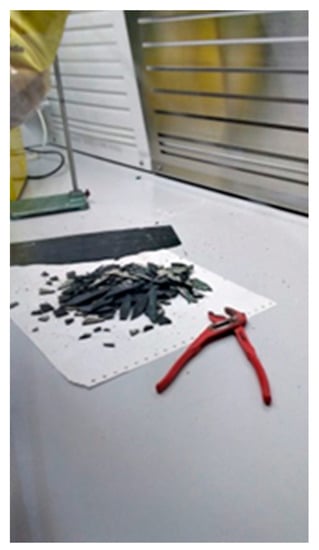 This test was carried out with impacts and drag that simulate the trampling of the vinyl floor; this simulation did not produce fiber release. The test did not produce powder. The results obtained with Equation (1) are C = 0 fibers/liter for both samples. This confirms the indications given by the Italian Ministerial Decree 06/09/1994 [4], which states that there is a release of fibers only in the case of abrasion, perforation, brushing or if the vinyl floor is very deteriorated (Table 3). Figure 15 shows incorporated asbestos fibers in adhesive vinyl matrix. Figure 16 shows a piece of the adhesive matrix of the vinyl floor.