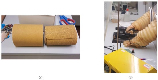(a) Sandpaper used for the test. Left: fine sandpaper (dimensions: P120). Right: coarse sandpaper (dimensions: P40). (b) Performed mechanical abrasion test inside the confined hood.