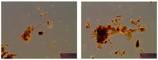 The results obtained for abrasion with fine-grained sandpaper are C = 12.97 fibers/liter for sample F and C = 24.42 fibers/liter for sample R. The abrasion of sample R produced more longer and free fibers compared to the ones of sample F. This particular aspect is shown in Figure 17 and Figure 18. The smaller fiber dimension of sample R had already been observed during the vinyl characterization test (Figure 6 and Figure 7).