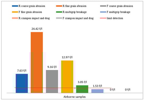 The only test that did not produce liberation of fibers was the crampon impact and drag. The other tests released fibers, in particular the abrasion simulation test. Lange [22] investigated the release of the asbestos fibers during the removal of floor tiles using scraping and lifting with ice scrapers with little or no water applied. He showed that the release of fibers, in this case, was low and that the probability of exposure is minimal. This result can be assimilated to the two drag and impact simulations with the crampon and multiplier breakage, which reported very low fiber release levels, even though they were carried out dry. However, the difference between a good, flexible floor and a bad, rigid floor must be taken into consideration during the removal operation, because the fiber release for rigid and poor-conditioned floor tile is higher.