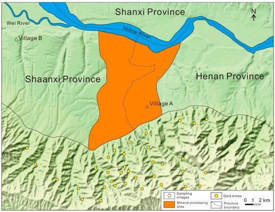 The Xiaoqinling gold mine belt spans Henan and Shaanxi provinces from east to west including Lingbao County, Tongguan County, Luonan County, and Huayin County. The areas of gold mining, smelting, and processing are near 1500 km2, which is the second largest hard-rock gold mining and processing base of China after Zhaoyuan gold mine in Shandong Province. The gold mining area is mainly distributed in the Xiaoqinling Mountains, and the agricultural area with many mineral processing and smelting industries is located especially at the junction region of Shaanxi and Henan province (Figure 1). Due to historical reasons, Xiaoqinling gold mining area is a typical representative of China’s disorder and weak awareness of environmental protection in mining development from 1986 to 2000. There were hundreds of large and small corporations and individually owned workshops in mining and beneficiation. The town- and individually owned workshops mainly used crude flotation, amalgamation grinding, cyanidation pond, and other methods for gold extraction. Crude flotation, amalgamation grinding, and cyanidation pond were widespread around the Xiaoqinling gold mining area and mainly adopted by local village collectives and individuals for gold extraction. The waste slag of mineral processing and smelting is dumped randomly in the fields, around the villages, and along the roads and rivers. Rainfall leaching, atmospheric dust fall, and river scour accelerate toxic trace elements entering rivers and soil, causing serious Hg, Pb, Cd, and Cu pollution in the soil and water environment around the mining areas. Some literature on the Xiaoqinlin gold mining area indicated the Hg in the soils and rivers mainly comes from the mercury flotation beneficiation. The Pb, Cu, Cd, and Zn are mainly provided by galena, sphalerite, chalcopyrite, and other ore minerals in gold-bearing quartz veins, while As and Cr exhibit poor correlation with Pb, Cu, Cd, and Zn [34].