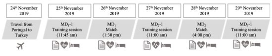 Data collection was performed throughout 5 consecutive days (3 training sessions and 2 matches) during an international tournament held in Turkey (Figure 1). Players habitual sleep and nocturnal cardiac autonomic activity were monitored every night. The players stayed in the same hotel and slept in twin rooms allocated by the technical staff. All training sessions were conducted outdoor in a natural grass pitch. The two competitive matches were held in the same stadium located at the Emirhan Sport Center (Antalya, Turkey). All facilities were closely located, and thus travel fatigue was avoided. Training schedules were set by the team coaching staff, with no interference by the research team (or with other routines, including habitual sleep habits). The players followed their normal dietary routine during the data collection period.