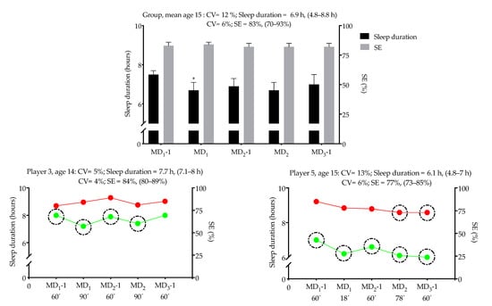 Figure 2 displays the group (n = 18) and individual sleep data of two players. The individual sleep data for all players is presented in Figure S1 (Supplementary Materials). The recommended cut-point of 8 h/night in the 5 nights was not reached by several players: MD1-1 (n = 16), MD1 (n = 17), MD2-1 (n = 13), MD2 (n = 14), and MD3-1 (n = 8). In MD1-1 and MD1 only two players had a sleep efficiency ≤74%, and in MD2 and MD3-1 only one player in each night did not reach the sleep efficiency threshold. Sleep duration CV ranged between 4 to 17%, while sleep efficiency ranged between 1 to 10% across the 5 days (Figure S1). Differences in sleep duration and SE patterns between athletes can be observed in the two figures displaying the data for players 3 and 5.