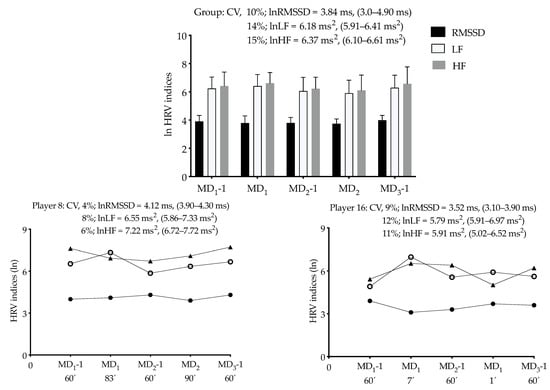 Analytical graph of the group (mean and 95% confidence interval) and individual cardiac parasympathetic activity (measured as natural logarithm of the root mean square of successive R-R intervals (lnRMSSD), natural logarithm of low frequency (lnLF), and as natural logarithm of high frequency (lnHF)) values of two players for each day of the tournament. Averages, maximum and minimum values are also presented. Abbreviations: MD, Match-day; CV, coefficient of variation.