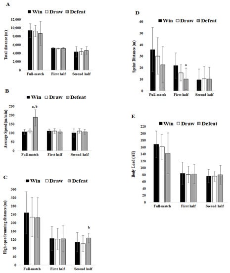 Comparisons between full, first and second halves for match results for (A) Total distance. (B) Average Speed. (C) High-speed Running Distance. (D) Sprint Distance. (E) Body Load. a denotes significant differences between win vs. defeat; a denotes difference between defeat vs. win; b denotes significant difference between defeat vs. draw. All (p < 0.05).