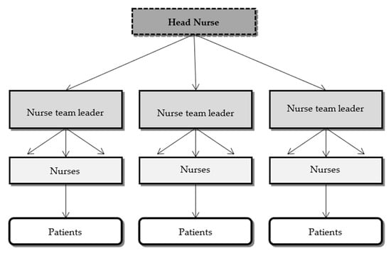 This method emerged in the 1950s as a response to low nurse staffing and widespread dissatisfaction among the professionals and patients with the functional nursing method [24]. It was created to take advantage of the mix of skills of the several members of the nursing teams. This method implements a philosophy where a leader leads a group of people. Thus, it is not considered a procedure. In this philosophy, all team members are familiar with the patient’s needs and/or problems, contributing in a particular way to his/her well-being [22]. Thus, the team nursing method assumes that the care provided will be of higher quality, efficacy, and safety when planned and provided as a team, due to the individual contributions of each nurse [7]. Nurses are divided into teams and guided and coordinated by leaders, maximizing the group’s capabilities and the individual qualifications and skills of each nurse [1]. Thus, each team is responsible for the full delivery of care to the patients who are under its responsibility (Figure 5).