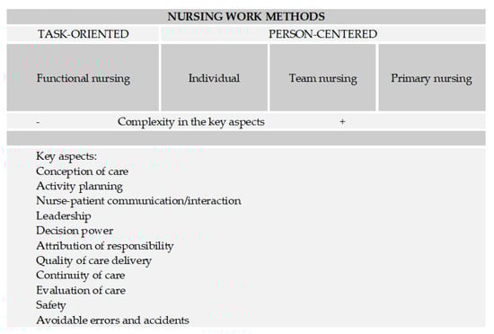 Traditionally, four dominant methods are mentioned in the literature on the organization of nursing care delivery: functional nursing, individual, team nursing, and primary nursing [4]. The work methods are conceptually organized into two major groups: the task-oriented method and the person-centered methods (Table 1). These methods are internationally recognized and commonly applied in clinical settings to support the organization in nursing care delivery, reflecting the social values, management ideologies, and resources of a team or organization [6].