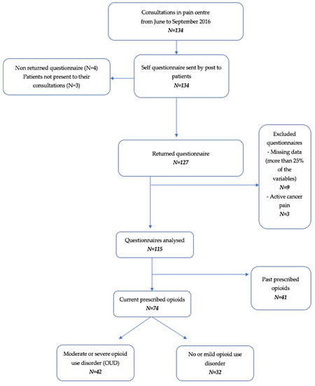 All patients referred by their general practitioner to the pain centre in the inclusion period were sent the questionnaire to identify patients with opioid misuse and p-OUD. The patients completed questionnaires at home and returned them at the first visit.