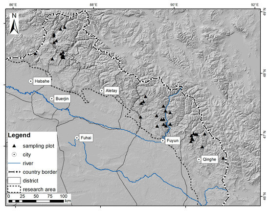 To further understand forest carbon storage, the more precise carbon sequestration studies focusing on various forest ecosystems in different regions are needed. Northwest China is located in the hinterland of the Eurasian continent. It has a typical inland desert environment and desert irrigation-based economy, which causes simple and vulnerable ecosystem structure with low biomass in natural ecosystems. Local forests play an essential role as ecological barriers for improving the environment, maintaining ecological balance, and ensuring the sustainable development of oasis [13]. The natural mountainous forest in the Altai Mountains has rich vegetation resources and high biodiversity in northwest China and regulates local rivers and floods [14]. Most forest studies of the Altai Mountains focus on tree rings and climate change effects [15,16,17]; the carbon storage of local forest and its distribution pattern are not fully analyzed.