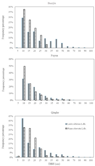 Additionally, the DBH of dominant species in different region inside study area shows that: the number of Larix sibirica increase from northwest to southeast (Table 2), and the DBH of Larix sibirica reaches peak (31–42%) around 10 cm (Figure 2). This implies a potential increase of carbon storage of the Altai Mountains in the future [7,39].