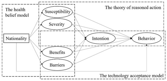 Health beliefs primarily comprise two aspects: threat perception and behavioral evaluation [19,20]. Specific to the current study, threat perception involves both “perceived susceptibility”, belief about the likelihood of contracting COVID-19, and “perceived severity”, belief about the seriousness of contracting COVID-19. Behavioral evaluation involves both “perceived benefits” that are associated with beliefs about the potential gains of staying at home and “perceived barriers” that are associated with beliefs about potential obstacles to staying at home. Based on the health belief model [8], individual factors such as nationality may impact the extent to which people perceive COVID-19 as a health threat and evaluate stay-at-home behaviors as a health-promoting action, which further influences the frequency with which people engage in stay-at-home behaviors during the pandemic.