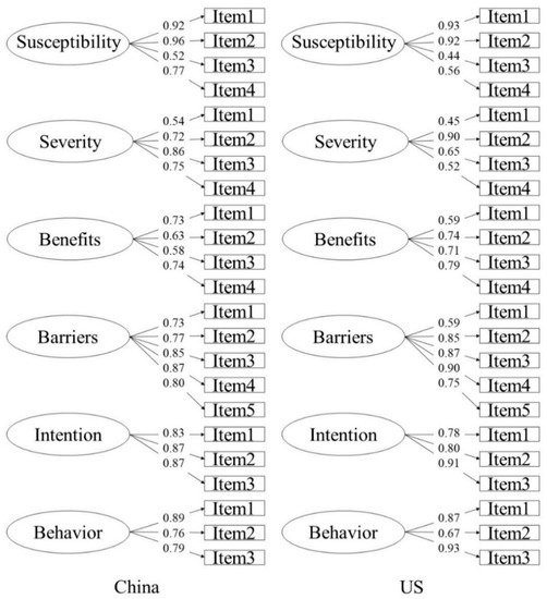 Furthermore, CFA was used to further examine the measurement model. Perceived susceptibility, perceived severity, perceived benefits, perceived barriers, behavioral intention, and actual behaviors were loaded on four, four, four, five, three, and three items, respectively. Not only an overall CFA but also two separate CFAs for the Chinese and American participants were conducted. As displayed in Table 2 and Figure 2, the model results showed good model fits and all the loadings were significant (p < 0.001). Additional tests on the measurement equivalence according to the ratio of Δχ2 and Δdf [39] showed that model 3 and model 2 had no significant differences (Δχ2/Δdf = 6.35 < 27.59, the cutoff of chi-square test with df = 17 was at the 0.05 level of significance). Similarly, model 4 and model 3 had no significant differences (Δχ2/Δdf = 14.48 < 22.36, the cutoff of chi-square test with df = 13 was at the 0.05 level of significance). These findings indicated that the measurement model had strong invariance for Chinese and American participants.