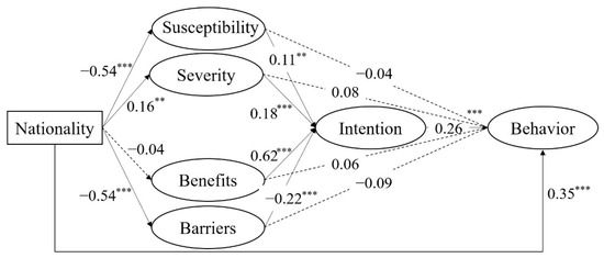 Means, standard deviations, and Pearson correlations are presented in Table 3. Gender was correlated with other variables except for perceived severity, and age was correlated with other variables except for behavioral intention. These correlations indicated that gender and age should be considered as covariates in the next step of analysis. Regarding the correlations among the main variables, nationality was correlated with other variables except for behavioral intention. Perceived susceptibility, perceived severity, perceived benefits, perceived barriers, behavioral intention, and actual behaviors were correlated with each other (0.13 < |r| < 0.52) except for non-significant associations between perceived susceptibility and perceived benefits, between perceived susceptibility and behavioral intention, and between perceived benefits and perceived barriers. It is worth noting that the square roots of the AVEs (see the diagonal elements in bold in Table 2) were greater than inter-construct correlations, which indicated good discriminant validity among these constructs [40].