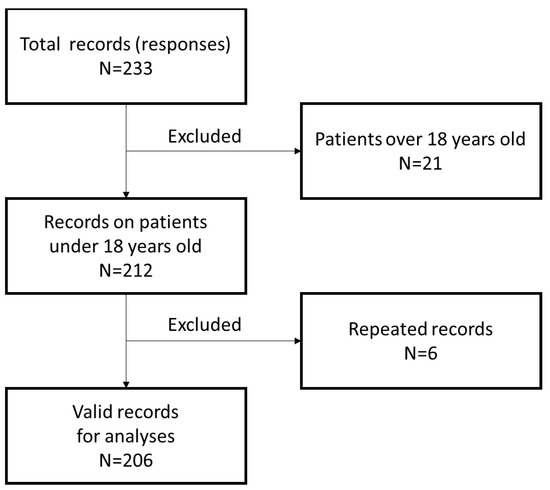 In total, 233 complete questionnaires were completed. After eliminating the questionnaires concerning patients over 18 years of age, 212 questionnaires were obtained. After eliminating the duplicates, 206 questionnaires were received (Figure 1).
