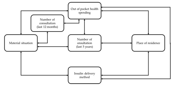 Significantly fewer connections were observed between the current health condition and the family situation of the child. The amount of health care expenses (out of pocket payments) was related to the type of insulin therapy applied (with the V-value of the Cramer’s coefficient being 0.558) and the frequency of follow-up visits to attending physicians of other specialties in the last 12 months and 5 years (with the V-value of the Cramer’s co-ordinates as 0.588 and 0.592, respectively). The child’s age was important in the case of the possibility of entrusting childcare to persons other than parents (caregivers). The lack of such a possibility concerned mainly the youngest children—those under the age of compulsory schooling (6 years). The average age of children whose parents could not count on this form of support from other people or institutions (n = 24) was 2.79 years.
