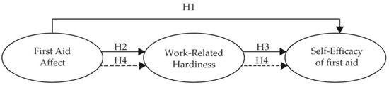 Both the association between first aid affect and self-efficacy of first aid and the association between hardiness and self-efficacy have been confirmed separately by previous studies [27,30,43,44]. Work-related hardiness is likely to be a mediator to influence the strength or direction of the relationship between first aid affect and self-efficacy of first aid [47]. To our knowledge, the role of hardiness as a mediator between affect and self-efficacy has not been examined. In order to establish the type of mediation, we followed the procedure presented by Zhao et al. [48]. Hence, we posited that: