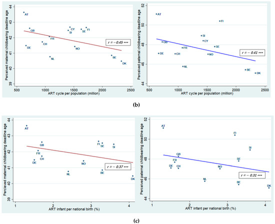 Lastly, the results also showed significant negative relationships between the percentage of ART infants and social childbearing deadline ages (maternal: r = −0.37, p < 0.001; paternal: r = −0.31, p < 0.001). Individuals who reside in countries with higher ART infant percentages were more likely to perceive lower maternal and paternal childbearing deadline ages, which also contradicts our initial hypotheses, that countries with higher numbers of infants born by ART would have higher perceived maternal and paternal deadline ages.