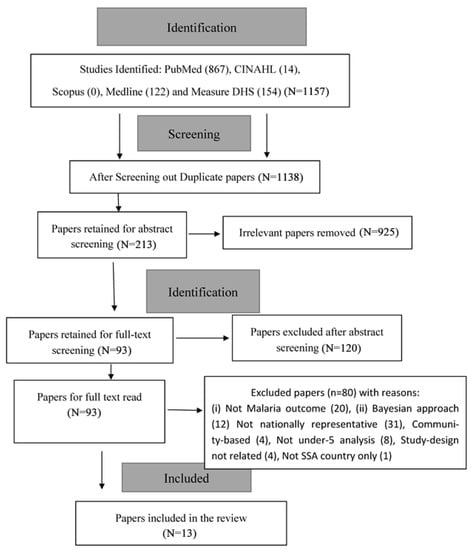 This review aimed to synthesize evidence from published articles describing the determinants (socioeconomic, demographic and contextual) of the malaria status of children under five years in SSA between January 1990 and December 2020. The flowchart diagram in Figure 1 shows the selection of studies included for review. A total of 1157 records were identified from all the databases consulted. Ninety-three (93) were retained for full-text examination, and only thirteen (13) unique publications (with 18 country-specific studies) met the inclusion criteria and were examined for this review.