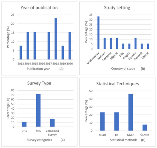 Table 2 describes the characteristics of the 13 extracted papers considered for this review. The information includes the author’s name and date of publication, the title of the paper, study location, survey type, target sample, the prevalence of the outcome, sample size, statistical methods, and software used for computation. The prevalence of malaria in children under five, as reported in the papers reviewed, ranged from 18% in Tanzania to 39% in Uganda, as reported in Njau et al. (2013) [26]. The mean sample size per study was 30,775 participants.