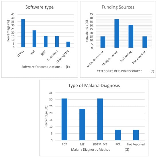 With more than 70% of the number of country-specific studies, the malaria indicator survey (MIS) was the most used survey among the included studies (chart C), followed by multi surveys (16%) and demographic and health surveys (11%). Likewise, chart (D) indicates that multivariate logistic regression methods (46%) were the most used statistical method. Furthermore, with 38%, STATA was the most preferred statistical software used in the selected publications. This was followed by SAS, SPSS and combined software applications. The least popular was JMP (7.6%). Funding sources (chart F) show that multiple sources of funding were the highest at (38%), while no funding was reported in 30% of the studies, and two of the studies did not disclose any funding source. Three diagnostic methods were reported to detect malaria infection status in children under five years. Among the studies included were rapid diagnostic test (RDT), microscopic test (of thin and thick blood smear), and polymerase chain reaction (PCR). Chart (G) shows that RDT and the combination of RDT and MT were the most popular, and one study reported using PCR.