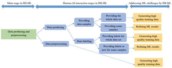 We discuss human tasks in human–AI interaction for data producing and pre-processing in ML separately in two subsections. In each subsection, for each human–AI interaction task, we describe the role of humans, the aim of the human collaboration and the results of this collaboration by providing indicative case studies related to HILML. To present a general overview of how humans interact in data producing and pre-processing and how this interaction address ML challenges in this stage, we provide a framework that is shown in Figure 1.