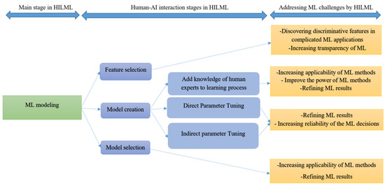 In addition to human collaboration in feature issues as the most common collaboration area to increase ML transparency in HILML, humans have been involved in different steps of ML applications to evaluate and refine ML results in terms of transparency and explicability [16]. For example, parameter tuning, selecting instances from the data sets for training to get desired results, adding some samples to the training data set and labelling and relabelling some data instances are human activities which result in steering and refining ML methods. They can help to increase transparency and explicability in ML applications. In Section 3.2, we describe these kinds of human–AI interaction in ML applications.