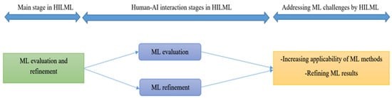 In HILML applications, the role of humans as users of the ML methods to evaluate and refine ML outputs is important because humans should be satisfied and use ML methods. Humans evaluate ML outputs and decide to refine the method or accept that. In this section, firstly, we investigate the role of human in the evaluation of ML methods, then explain the role of human in human–AI interaction for refining ML outputs. A general framework of human–AI interaction in this ML stage as well as ML challenges addressed by this interaction is shown in Figure 3.