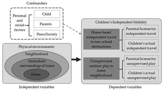 The social–ecological model [42] is frequently used to guide research on human behaviors and relevant environmental interventions from multiple levels, including intrapersonal factors, interpersonal processes and primary groups, institutional factors, community factors, and public policies. This study proposed a conceptual framework about CIM (Figure 1) based on the Social–Ecological Model for Child’s Development [43], which emphasizes the significance of children’s immediate environments to their development. This is grounded in the consideration that a child’s biological and psychological makeup is based on individual and genetic developmental history, but also continues to be affected and modified by the child’s immediate physical and social environment (microsystem), as well as interactions among the systems within the environment (mesosystems) [43,44]. The proposed conceptual framework considers multilevel factors affecting two modes of CIM, including personal and social factors, as well as physical environmental factors of an individuals’ home, the immediate surroundings of the home, and the surrounding neighborhood.