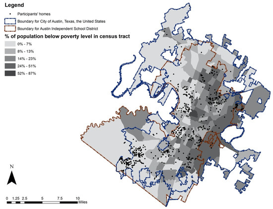The study setting consists of the AISD and a small area that is not in AISD but within the boundary of the City of Austin (Figure 2). This area has a diverse population with varying sociodemographic characteristics and diverse neighborhood environments. In the 2018–2019 academic year, AISD had an enrollment of 79,787 students, and more than half (55.5%) of them were Hispanic; the rate of economically disadvantaged students (i.e., a student who is eligible for free or reduced-price meals under the National School Lunch and Child Nutrition Program) was 53.5% [45]. Among 42,599 students from the total of 87 public elementary schools in AISD, 56.1% of them were Hispanic (n = 23,877), and 57% of the total students were eligible for free or reduced-price lunch (n = 24,297).