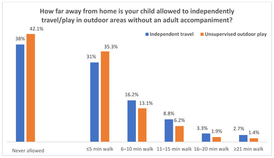 This study’s two outcome variables—children’s home-based independent travel to non-school destinations and unsupervised outdoor play in neighborhood—were measured through parents’ or guardians’ report of (1) mobility “license,” which refers to their permission for their child to independently travel and play without adult supervision, and (2) their child’s actual fulfillment of independent mobility. Two specific questions were asked in the survey to capture mobility license, including “how far away from home is your child allowed to go without adult accompaniment?” and “how far away from home is your child allowed to play in outdoor areas without adult accompaniment?” Six options in terms of children’s mobility ranges were provided, including “never allowed,” “less than 5 min walk,” “6–10 min walk,” “11–15 min walk,” “16–20 min walk,” and “more than 20 min walk.” Furthermore, in order to measure the actual fulfillment of independent mobility, parents or guardians were asked to select neighborhood destinations that their children actually independently travel to, and to report the daily average time that children spent on unsupervised outdoor play in total and at each neighborhood location (e.g., school, park, playground) or place directly near their homes (e.g., own yard, own driveway, frontage street).