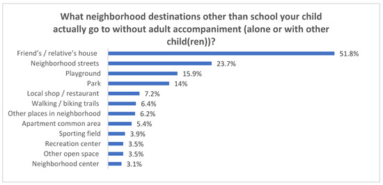 The most popular neighborhood destination that children actually independently traveled to was a friend’s or a relative’s home within the neighborhood (Figure 4). More than half (51.8%) of participants’ parents or guardians reported a friend’s or a relative’s home as the destination for their children’s actual independent travel. Other popular neighborhood destinations included neighborhood streets, playgrounds, parks, etc.