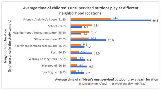 In order to better understand the spatial and temporal patterns of unsupervised play, the survey also asked about the availability of specific neighborhood amenities and places around homes, and how much time the child typically played there on a weekday or weekend day without adult supervision. Figure 5 illustrates the percentages of participants having these neighborhood amenities, and among them, how much time their child spent for unsupervised play at each destination. Among participants who had these specific amenities in their neighborhood, a friend’s or a relative’s home was where children spent most of their time playing both on a weekday (an average of 23.3 min/day) and a weekend day (an average of 46.8 min/day). For other locations, the popularity varied between weekdays and weekend days, with schools, neighborhood/recreation centers, and other open spaces being the most popular places following a friend’s/relative’s house on weekdays, and with other open spaces, parks, and playgrounds being the most popular locations following a friend’s/relative’s house on weekend days. Time spent on unsupervised play was in general longer during weekend days.