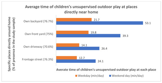 The survey also asked about the presence and use of specific places directly near home for unsupervised outdoor play. The percentages of participants with their own backyard, front yard, driveway, and frontage streets were 76.7%, 75%, 70.6%, and 76.3%, respectively (Figure 6). Among families having these places, children spent the most time playing in their own yards, especially backyards, without adult supervision. For those with backyards, parents reported an average of 21.7 min that their child spent playing there without supervision on a weekday, and an average of 53.1 min on a weekend day. In contrast, children spent slightly less time in their front yards than in backyards, with an average of 19.8 min on a weekday and 40.2 min on a weekend day.