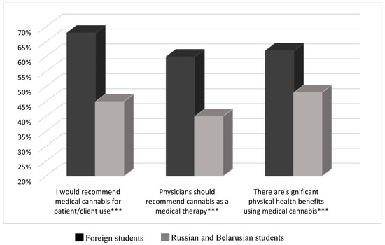 Figure 1 and Figure 2 provide information about MEMS, IMS, and RBMS medical student cannabis attitudes and beliefs. Figure 1 shows that foreign students report more positive attitudes toward MC use than their Russian and Belarusian counterparts. Foreign students, more than those of Russian and Belarusian origin combined, reported more personal cannabis use (15.8% vs. 6.9%; p < 0.001), feeling better prepared to answer client questions about MC (60.7% vs. 48.1%; p < 0.001), and having received formal education about the substance (41.6% vs. 14.7%; p < 0.001). Moreover, foreign students tend to be more supportive of the need for drug policy change regarding cannabis for medical purposes (82.2% vs. 72.2%; p < 0.001).