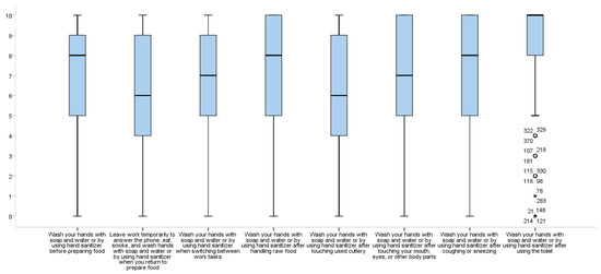 Evaluation of HHK and HWBs among chefs showed that the respondents’ KS for “Hands should be washed with soap and water or by using hand sanitizer after touching used cutlery” (74.8%) were significantly lower than their KSs for other items, while KSs for “Hands should be washed with soap and water or by using hand sanitizer before preparing food” (97.4%) and “Hands should be washed with soap and water or by using hand sanitizer after using the toilet” (98.0%) were significantly higher than for other items (χ2 = 177.48, p < 0.001) (Table 3). Respondents generally reported lower adoption of “Leave work temporarily to answer the phone, eat, smoke, and wash hands with soap and water or by using hand sanitizer when you return to prepare food” (median = 6.00, possible range 1–10) and “Wash your hands with soap and water or by using hand sanitizer after touching used cutlery” (median = 6.00, possible range 1–10) compared with the other HWBs (Figure 1). The most commonly adopted HWB was “Wash your hands with soap and water or by using hand sanitizer after using the toilet” (87.4% of respondents reported engaging in this HWB more than 6–10 out of 10 times), followed by “Wash your hands with soap and water or by using hand sanitizer before preparing food” (74.4% did so 6–10 out of 10 times) (χ2 = 131.69, p < 0.001) (Table 4).