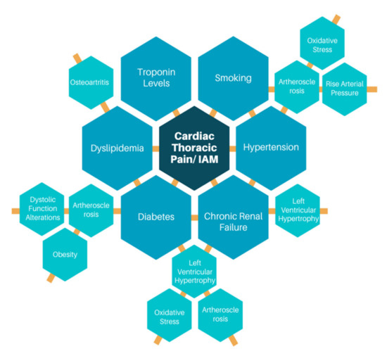This documental research confirms the correlation between the proposed secondary risk factors related with possible thoracic pain with cardiac origin. In Figure 1, the diagram above shows graphically the relation between these variables, which was confirmed by both the assessment with machine learning and bibliography. The figure is divided into three main components, the blue navy hexagon in the center indicates the target, which is thoracic pain with cardiac origin, the second level with blue hexagons shows the six main conditions proposed as factors to consider in the determination of a cardiac event with thoracic pain as symptom, and the last level with light blue hexagons shows some effects that the main factors have in health. The orange lines used in Figure 2 express the relationship between the conditions.