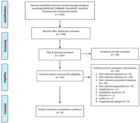 The electronic search identified 822 candidate studies, 706 of which remained after the elimination of duplicates (Figure 1). A total of 599 publications were excluded, and 107 remained for title and abstract screening, of which 44 were excluded and 63 remained for full-text examination, of which 55 were excluded, as the goal was to include cross-sectional and cohort studies that reported the prevalence of PTDS and carried out a regression analysis of possible risk factors. The final search resulted in a total of eight studies enrolled in the qualitative synthesis. The eight studies were of cross-sectional design and are summarized by characteristics in Table 1, quality in Table 2, and estimates (prevalence and odds ratio) in Table 3 [3,20,21,22,23,24,25,26]. Six of the eight studies reported PTSD symptoms among healthcare professionals during the COVID-19 pandemic in Asia (China [20,21,22], Singapore [3], and India [3]) and North America (United States of America [23,24]), while two studies were undertaken during the SARS-2003 pandemic in Asia (China [25] and Singapore [26]).