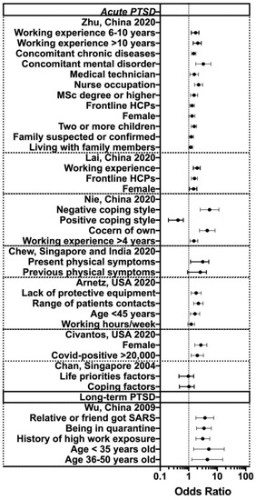 The following variables have been shown by multivariable logistics regressive research to correlate with a higher risk of acute PTSD symptoms (Figure 2): age (<45 years old), OR 1.67 (95% CI: 1.14, 2.44) [23], female, OR between 1.31 (95% CI: 1.02, 1.66) [21] and 2.68 (1.64, 4.37) [24], working experience >4 years, OR between 1.53 (95% CI: 1.12, 2.10) [22] and >10 years, OR 2.02 (95% CI: 1.47, 2.79) [21], frontline HCPs engaged in direct diagnosis, treatment, and care of patients with COVID-19, OR 1.32 (95% CI: 1.10, 1.59) [21] to 1.60 (95% CI: 1.25, 2.04) [20], frequency of contact with COVID-19 patients, OR 2.19 (95% CI: 1.50, 3.19) [23], working hours/week, OR 1.23 (95% CI: 0.93, 1.62) [23], lacking access to adequate personal protective equipment (PPE), OR 1.83 (95% CI: 1.22, 2.74) [23], COVID-19 positive cases above 20,000 cases, OR 2.01 (95%CI: 1.22, 3.31) [24], and knowledge–attitudes–practices (KAP) factors such as concern of own, OR 4.48 (95% CI: 2.38, 8.42) and negative coping style, OR 5.40 (95% CI: 2.54, 11.46). Other risk factors reported by Zhu et al. [21] were education level of master’s degree or higher, OR 1.55 (95% CI: 1.16, 2.07), nurse occupation, OR 2.24 (95% CI: 1.61, 3.12), medical technician, OR 1.57 (95% CI: 1.12, 2.21), concomitant chronic diseases, OR 1.51 (95% CI: 1.27, 1.80) or mental disorder, OR 3.27 (95% CI: 1.77, 6.05), social status such as living with family members, OR 1.18 (95% CI: 1.01, 1.38), family members or relatives suspected or confirmed COVID-19 case, OR 1.23 (95%CI: 1.02, 1.48), and parental status of two or more children, OR 1.56 (95% CI: 1.22, 1.99). Chew et al. [3] found a bidirectional positive association between physical symptoms and PTSD, OR 2.70 (95% CI: 1.40, 5.24) and between PTSD and physical symptoms, OR 2.20 (95% CI: 1.12, 4.35).