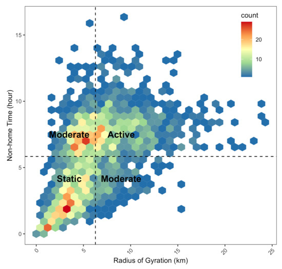 Stratification of individuals’ travel patterns based on the averaged travel distance (RoG) of 6.27 km and time spent away from home (Non-home time) of 5.84 h.