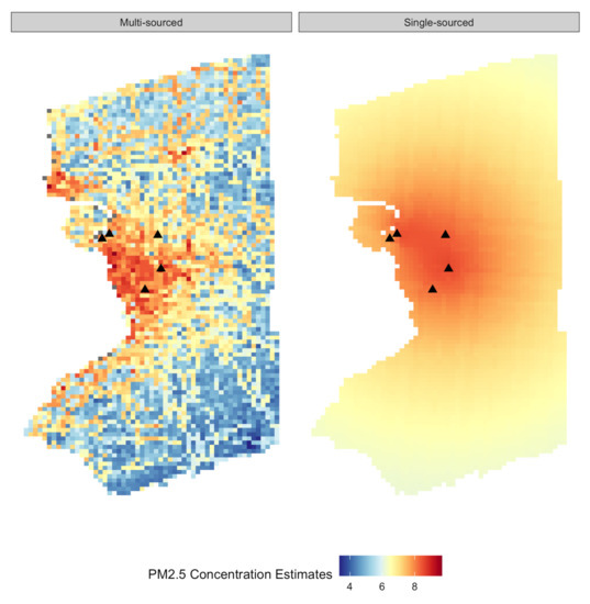As illustrated in Figure 2, the PM predictions of a single day (12/01/2016) obtained from the single-sourced exposure model in the right panel resulted in smoother spatial structures than the multi-sourced exposure model in the left panel. This is highly anticipated because the smoothing effect of the Ordinary Kriging is well known by geostatisticians and is considered as a serious drawback [69]. Specifically, the smooth patterns of PM prediction in the right panel of Figure 2 is a result of making predictions from sparsely sampled air monitoring data (denoted as the symbol of triangles), where low levels of PM predictions were overestimated and high values were underestimated. Meanwhile, the PM prediction from the multi-sourced model in the left panel of Figure 2 depicted local variations of daily PM concentrations that were affected by the proximity to road networks, the spatial variations of population density and land use type. These visual inspections were also asserted by the spatial 10-fold cross validation (CV), where the multi-sourced model outperformed the single-sourced model with CV-R of 0.74 versus 0.66. A similar pattern was found in the comparison of RMSE/MPE of the two models: 1.91/1.40 µg/m for the multi-sourced model and 1.96/1.49 µg/m for the single-sourced model.