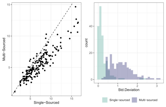 Lastly, we compared the spatial averaged PM concentration levels from both models at each day during the study period. This comparison is significant because the daily spatial variation of PM predictions could directly affect personal exposure estimates. As presented in Figure 3, the single-sourced model consistently yielded higher PM concentrations than the multi-sourced model except a few days (see the left panel). We also examined the distribution of spatial variation of the estimated daily PM concentrations from both models using the histogram in the right panel. The standard deviation of the estimates across the study area is much smaller for a single-sourced model compared to the multi-sourced model, suggesting that the single-sourced model might result in over-smoothed PM predictions.