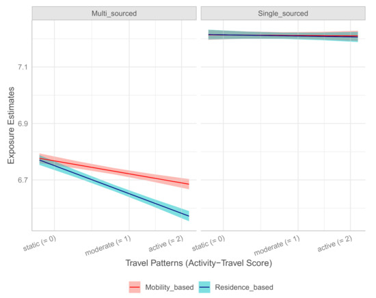 To facilitate the understanding of this significant three-way interaction, we plotted the effect of mobility patterns on personal exposure in Figure 4. The long-term exposure estimates from the single-sourced model are substantially higher than the multi-sourced model. Further, there was no effect of travel pattern on exposure estimates when the single-sourced model was used regardless of whether they were based mobility or residence (in the right panel). In contrast, when the daily ambient PM was predicted from the multi-sourced exposure model, the effect of mobility varied depending on whether an individual’s travel pattern is static or active (in the left panel). Greater activity-travel scores were associated with lower levels of exposure estimates, when individuals’ long-term exposure was estimated at residence. That is, the time-weighted exposures taking into account both multiple places visited by individuals and the time spent at each place was higher than one’s residence-based exposure.